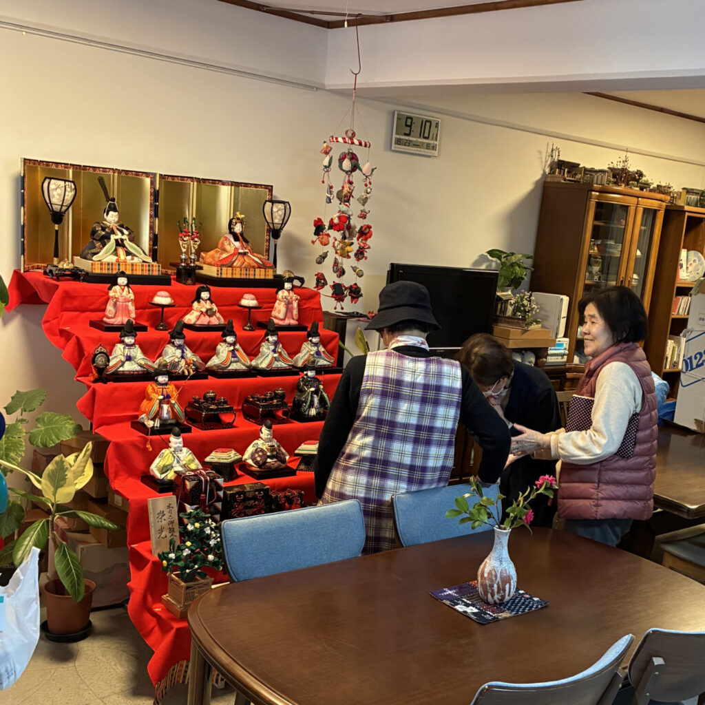吊るし雛の飾りは、ご入居者の方が、一つ一つ、 丁寧に心を込めて作られたものです。